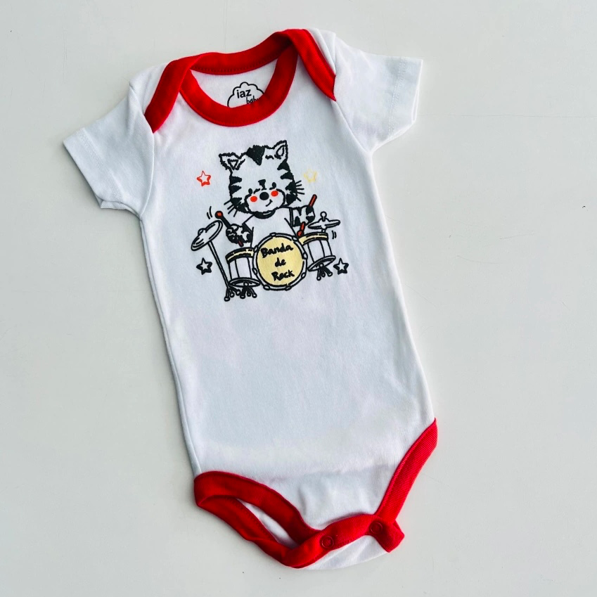 Body bebê com estampa divertida de rock, ideal para vestir com conforto e estilo. Tecido macio, 100% algodao, suave na pele sensível, respirável e mantém o bebê seco. Fechamento por botão na região inferior para troca rápida, prática e segura. Detalhe em acabamento vermelho que valoriza o visual. Perfeito para momentos de brincadeira, sono e passeios com qualidade e durabilidade.