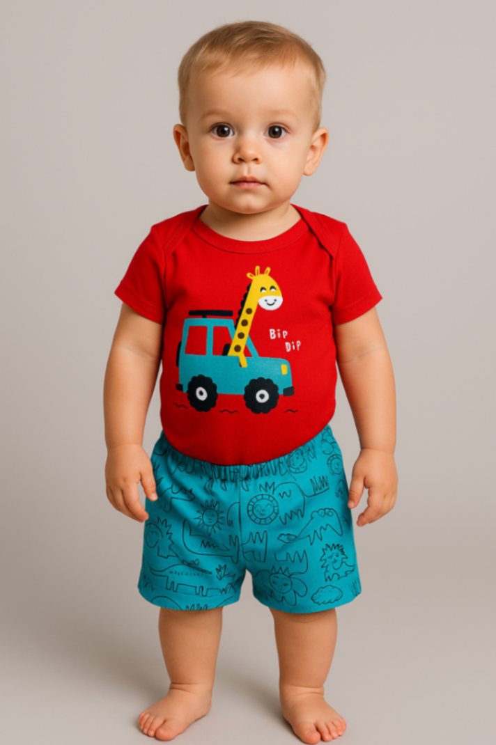 Conjunto Bebê Girafinha — conforto macio e toque suave para o dia a dia do seu bebê. Camiseta de algodão com estampa de ursinho, combinada com shorts em tom terroso e estampa fofa. Elástico na cintura facilita vestir e ajusta bem ao corpo. Tecido resistente e fácil de lavar, ideal para brincadeiras, passeios e soneca. Perfeito para presentear ou compor looks práticos e estilosos.
