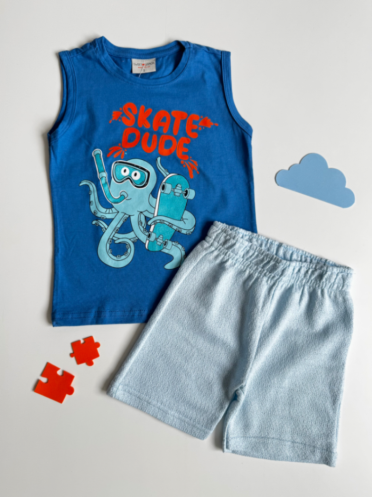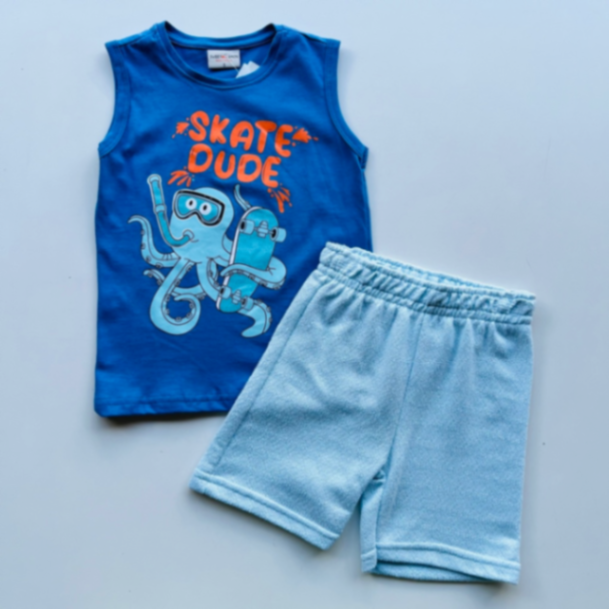 Conjunto infantil composto por camiseta azul com estampa de dinossauro e bermuda cinza. Tecido macio e respirável para o conforto das brincadeiras diárias, com costuras reforçadas que duram no dia a dia. Gola redonda e mangas short para facilitar movimentos; bermuda com cintura elástica que acompanha o crescimento. Perfeito para passeios, escola ou momentos de lazer em família.