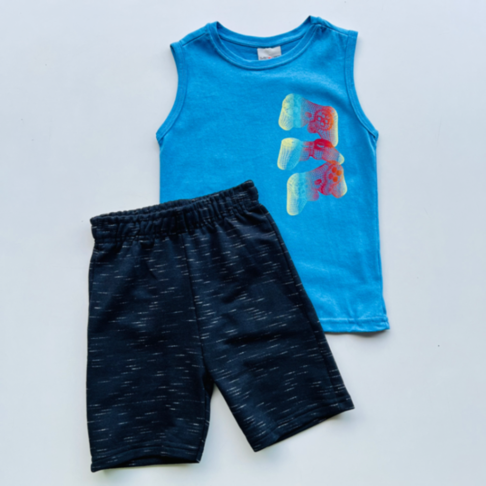 Conjunto infantil indispensável para dias quentes: camiseta sem mangas em azul vibrante com estampa divertida + bermuda azul marinho, prática e leve. Tecido macio, toque suave e cintura elástica proporcionam conforto o dia inteiro e fácil vestível. Ideal para brincar, passear ou curtir a escola. Durável, com costuras reforçadas, acompanha o crescimento e facilita a lavagem.
