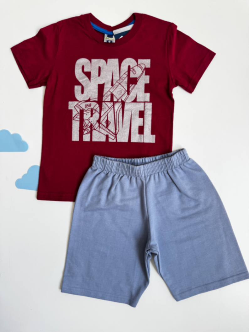 Conjunto infantil composto por camiseta de algodão macio e bermuda de tecido leve, oferecendo conforto o dia inteiro. A estampa Space Travel confere estilo moderno para as aventuras das crianças, sem abrir mão da praticidade.
