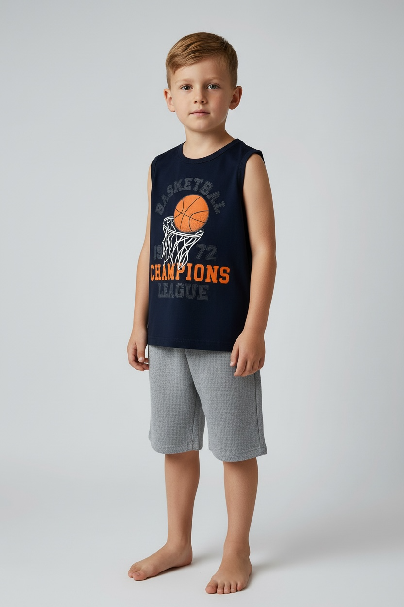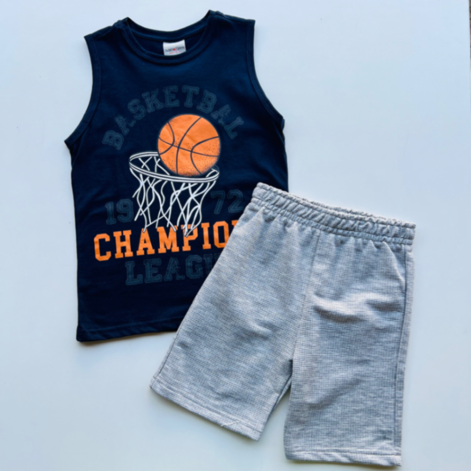 Conjunto infantil composto por regata sem mangas em algodão macio e bermuda cinza leve. Tecido com toque suave, costuras reforçadas e cós elástico para ajuste rápido e conforto o dia inteiro. Estampa de basquete na regata confere estilo esportivo moderno, ideal para brincadeiras, treinos e passeios. Perfeito para crianças ativas, oferecendo mobilidade, praticidade e muito estilo.