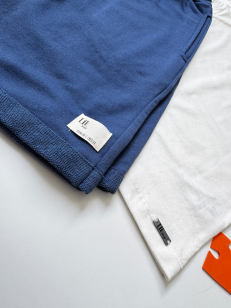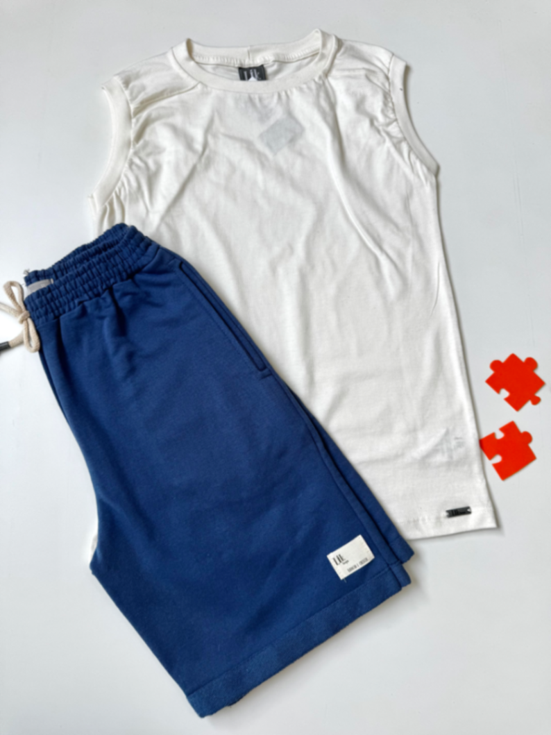 Conjunto completo para dias quentes: regata branca de toque macio e bermuda azul com cordão ajustável. Tecido leve e respirável, cós elástico com cordão para ajuste seguro, ideal para brincar, praia ou piscina.