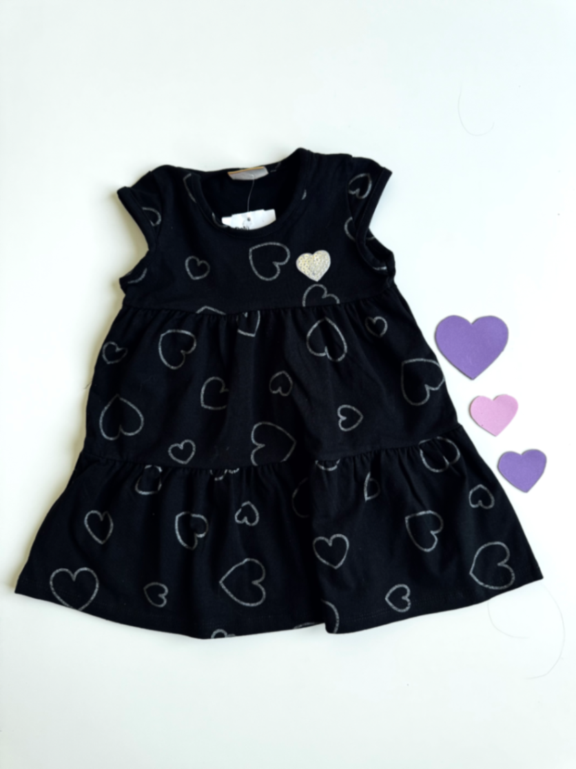 Vestido infantil preto com estampa de corações prateados. Confeccionado em tecido macio que respira, com caimento solto e saia em camadas para mobilidade e estilo. Sem mangas, ideal para dias quentes e festas, mantendo o conforto o dia todo. Ótima opção para combinar com tênis ou sapatilhas, perfeito para acompanhar a criançada em qualquer ocasião.