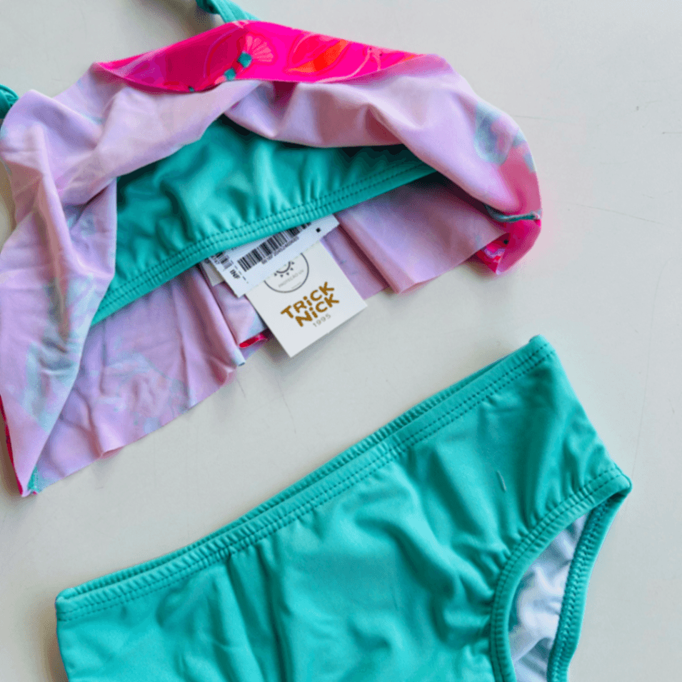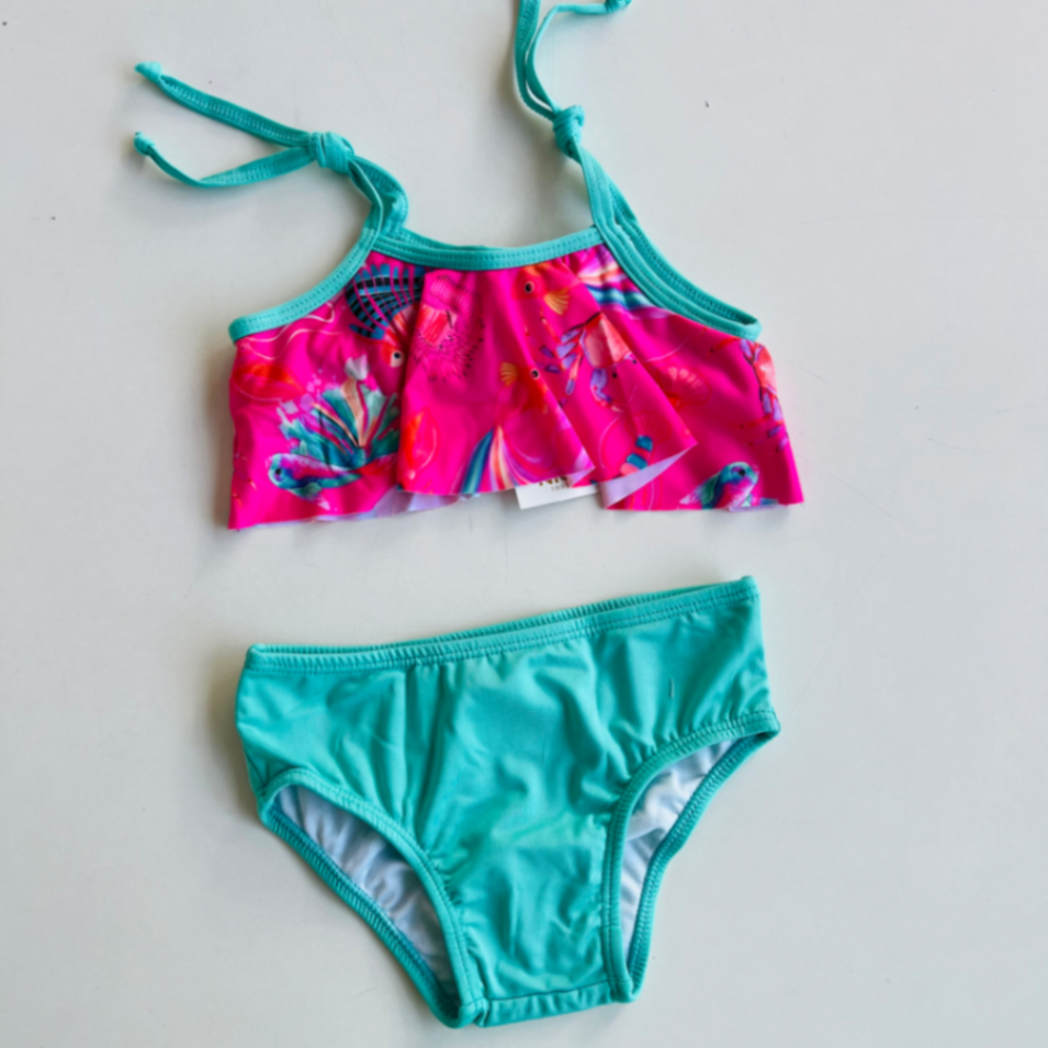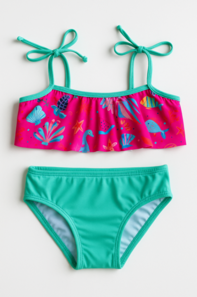 Conjunto de banho infantil com top de alças ajustáveis e calcinha de cintura média, em estampa marinha com sereias e conchas em tons rosa e turquesa. Tecido macio, secagem rápida e costuras reforçadas para durabilidade durante brincadeiras na praia ou piscina. Conforto e estilo para meninas que adoram cores vibrantes.
