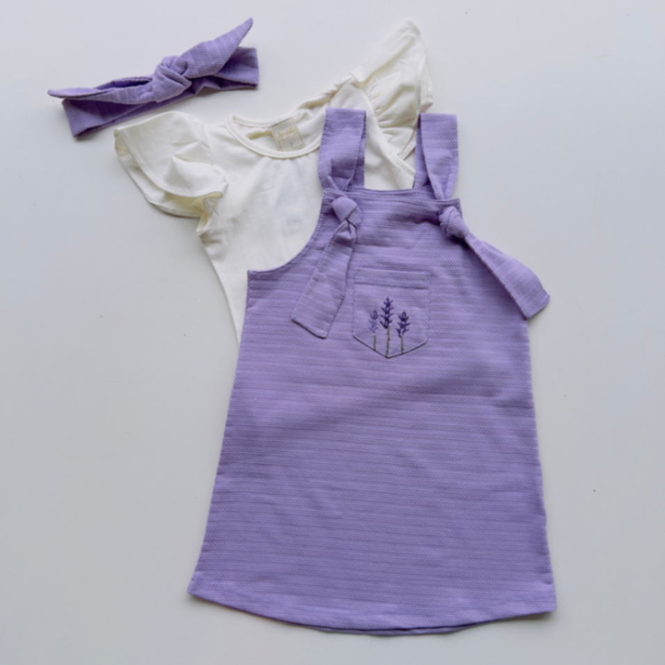 Vestido lilás para menina com alças largas e laços na frente. Possui delicado bordado de ramos de lavanda e tecido texturizado, macio e confortável para o dia a dia. Ideal para festas, festinhas ou passeios, mantendo estilo e conforto. Acompanha faixa de cabeça combinando para um look completo e charmosa apresentação. Costuras reforçadas; fácil de lavar.