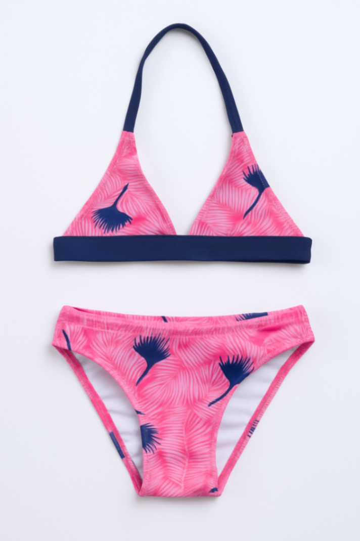 Conjunto de biquíni com estampa rosa de folhas e detalhe em azul marinho. Top triangle com alças ajustáveis e calcinha de cintura média, costuras reforçadas e tecido de secagem rápida. Conforto ao vestir, boa cobertura e ajuste seguro para brincar na praia ou piscina. Ideal para quem busca estilo moderno, qualidade e praticidade no verão.