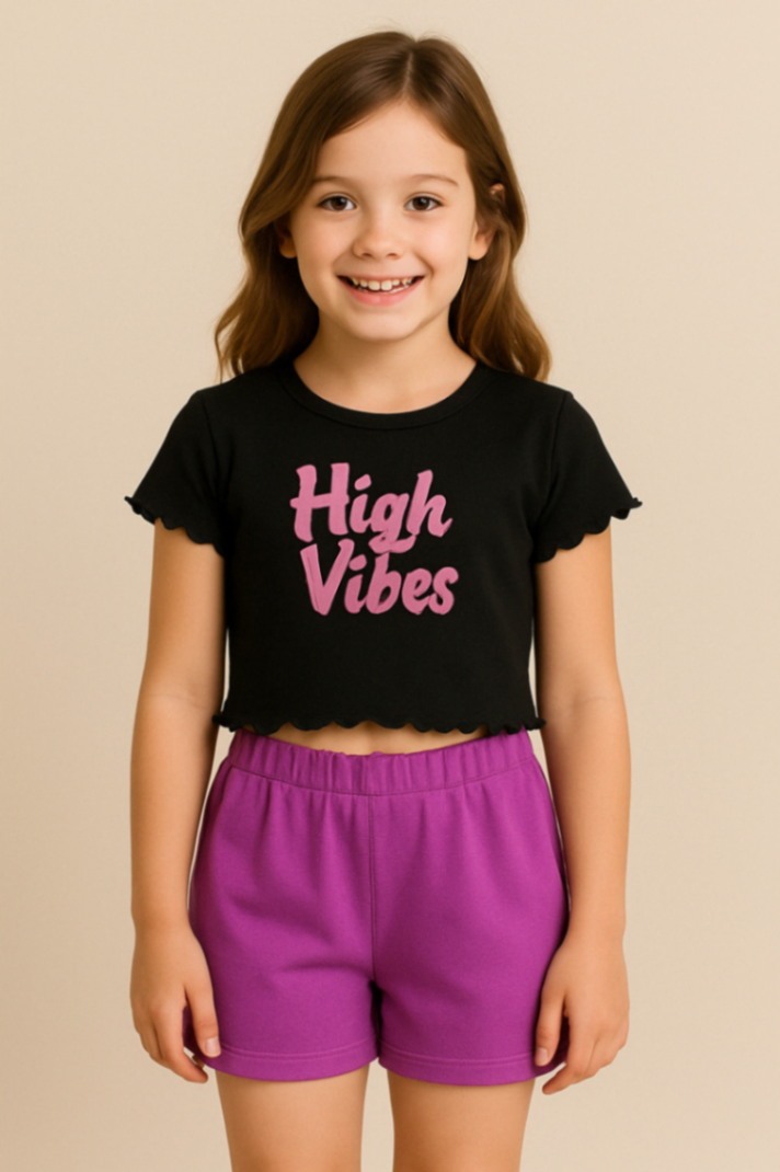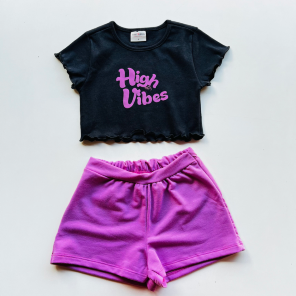 Conjunto infantil composto por blusa cropped preta com estampa High Vibes em rosa e shorts roxo de cintura elástica. Tecido macio, toque suave e acabamento com barra franzida na blusa, proporcionando caimento moderno sem irritar a pele. Ideal para atividades diárias, brincadeiras e passeios, mantendo o look moderno e confortável o dia inteiro. Combine com tênis casual para um visual despojado.