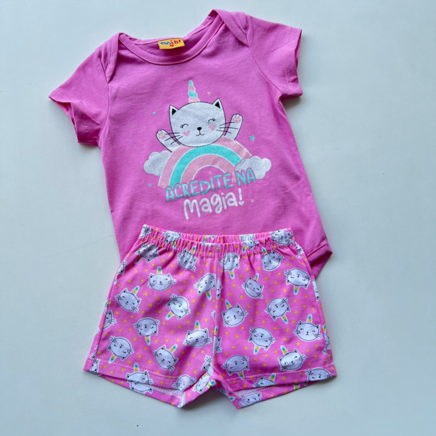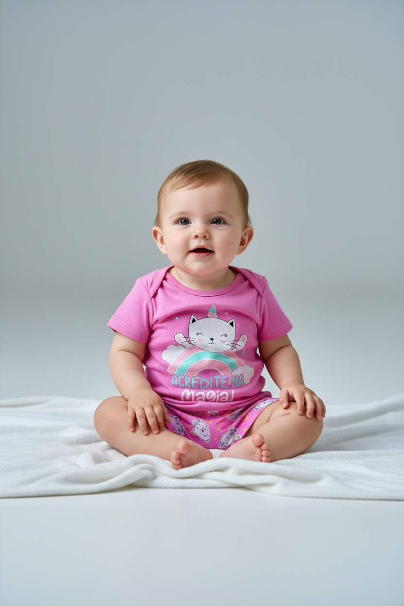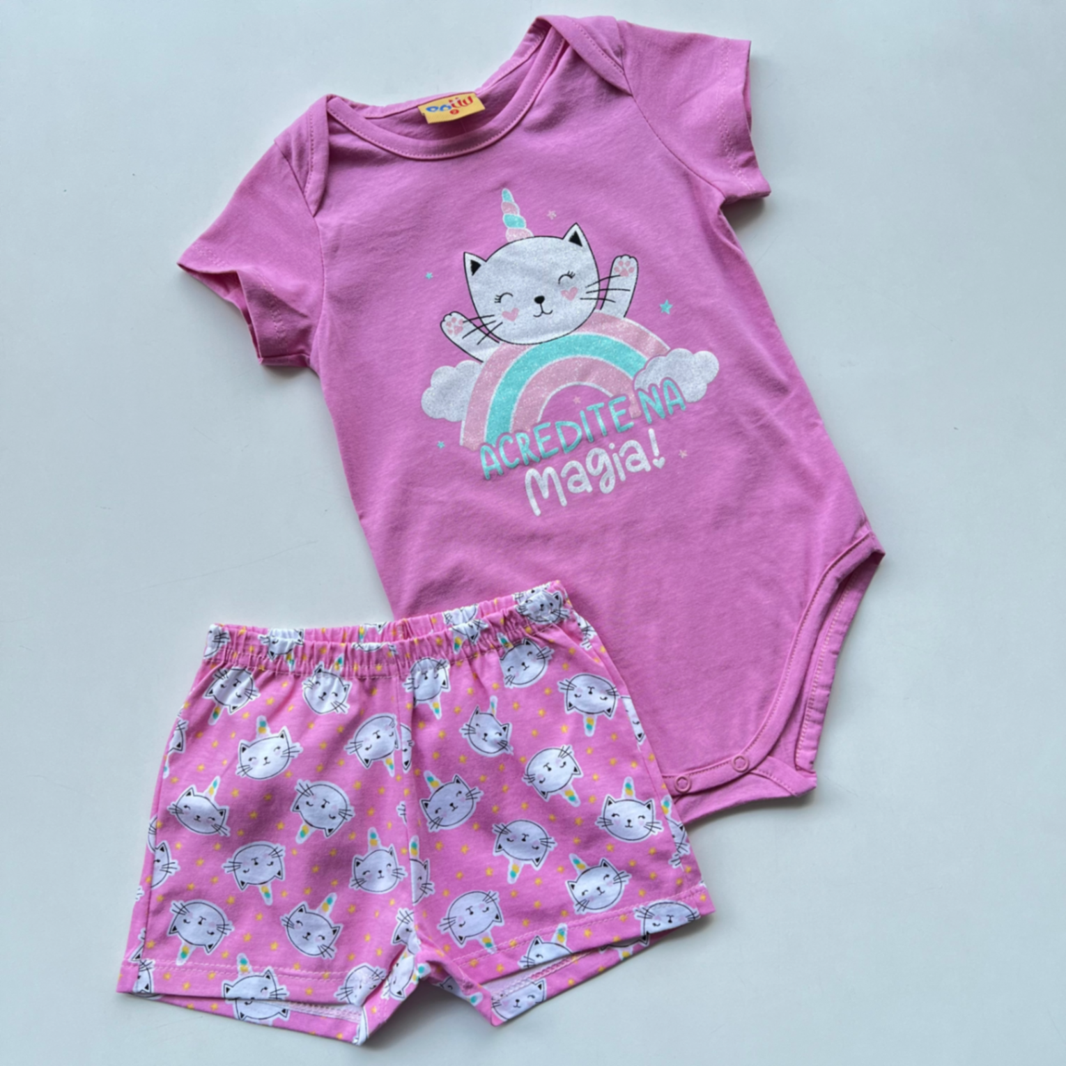 Body bebê menina em cor rosa, com estampa fofa de gatinho e arco-íris. Confeccionado em tecido macio de algodão, oferece toque suave para a pele sensível do bebê e excelente respirabilidade. Fechamento por snaps entrepernas, troca rápida e prática. Modelagem confortável que acompanha os movimentos da criança, ideal para passeio, descanso e dia a dia.